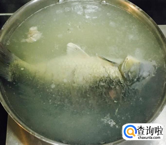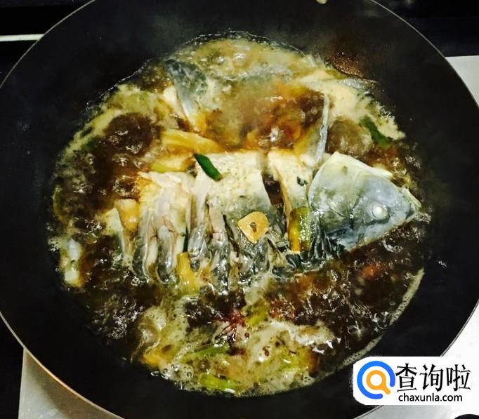 加入适量的清水或骨汤,加适量的盐调味儿。放入焯过水的鲤鱼盖好锅盖中火烧制