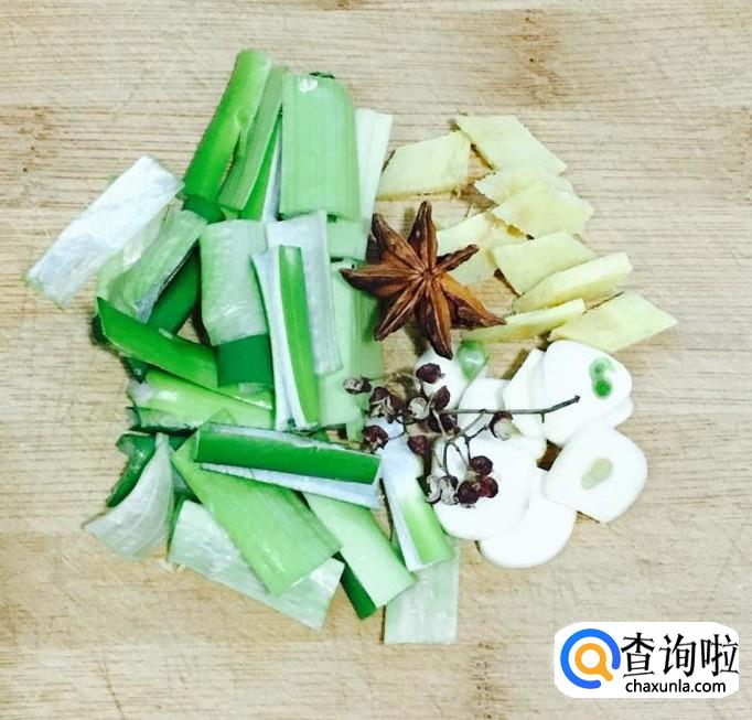 葱、姜、蒜剥去外皮清洗干净分别切成葱段、姜片、蒜片,八角、花椒用水冲洗干净备好,喜欢吃辣的朋友可以放点干红辣椒