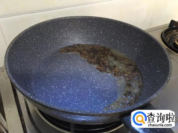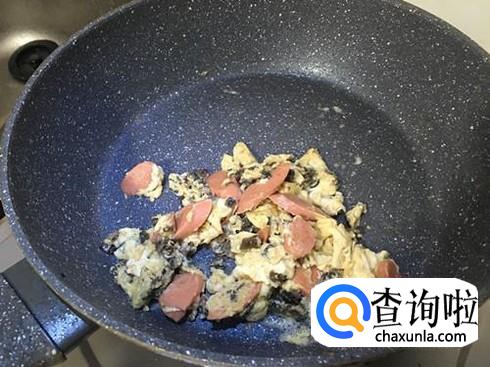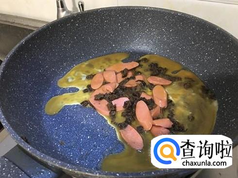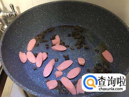 火腿切成片,放入锅中,稍微翻炒到有香味