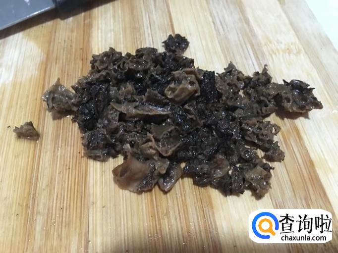 把羊肚菌沥干水,泡着的水不要倒掉,放着备用,羊肚菌切成丁备用