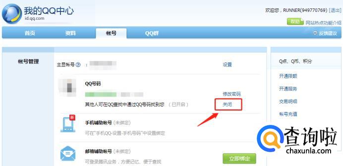 注意,如果你还没有设置辅助账号(手机号或邮箱任一),是无法关闭的QQ查找的。