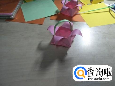 然后再将折叠好了图形的这四个支出的部分,用笔将它卷曲成花瓣的形状,然后再用另外一张纸将它折叠成花篮的把手部分,接着再将它嵌进花篮的两边,最后一个漂亮的花篮就做好了,快来试一试吧。