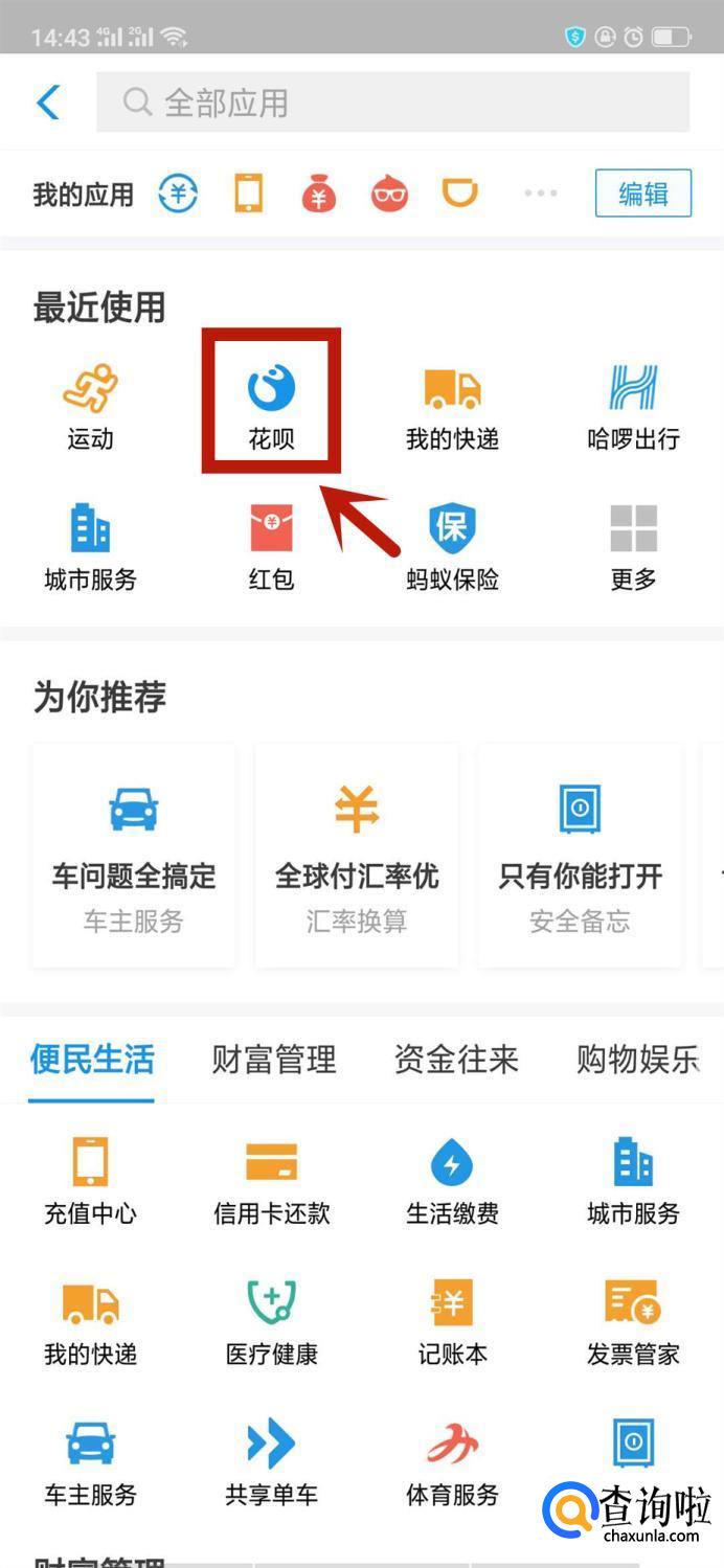 在最近使用里找到花呗,点击进入。
