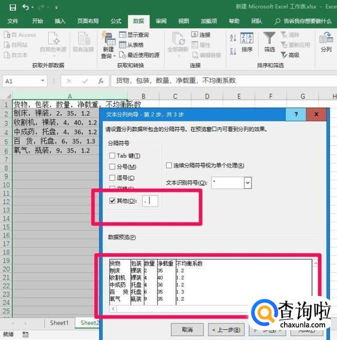 分隔符号选择“其他符号”再在后面的框中输入“,”,因为我们的文档中是用“,”间隔的。下面可以预览是否达到预期效果。如果可以的话点击完成即可,如果想删除其中一列,或者设置某一列的数据格式可以点击“下一步”设置。