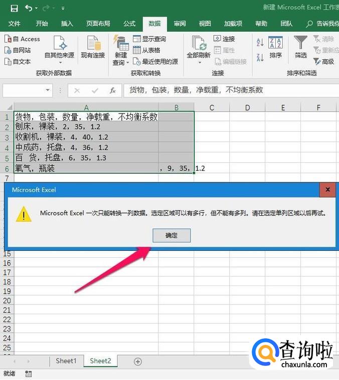 复制到excel中的内容有一下几点要求,间隔号用“,”号,使其处于同一列中,不然后面操作也是无法完成的(如果由于含有其他而导致不在同一列,在下一步分列的时候会有提示“excel只能一次转换一列数据,选定区域可以有多行,但不能有多列,请选择单列区域再试”。