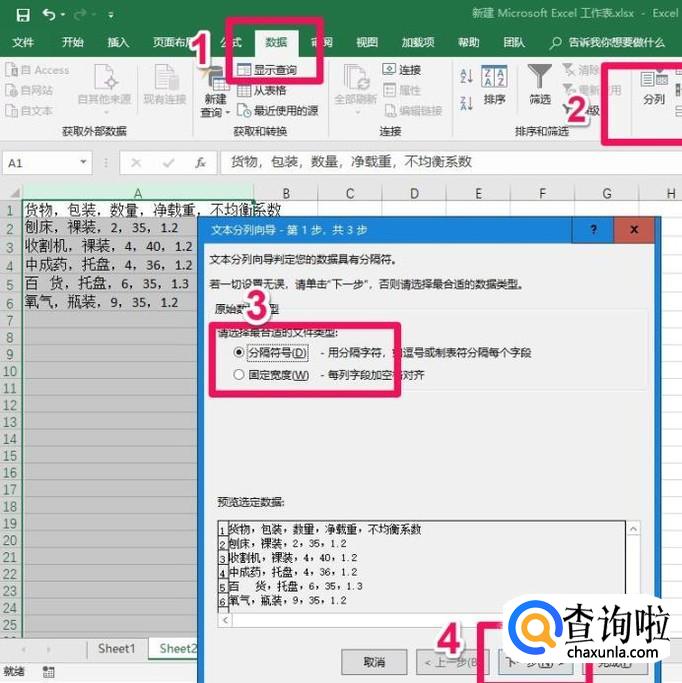 复制好之后选中整列数据,点击“数据”---“分列”---选择“分隔符号”,再点击“下一步”,这一步的意思就是以分隔符为单位将原始数据分列。