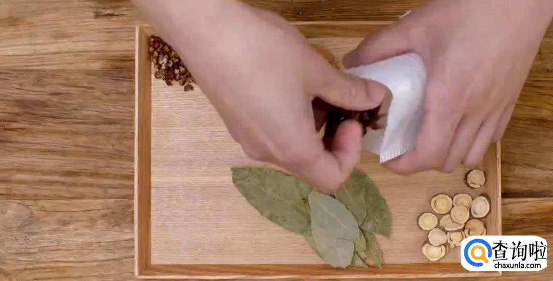 取八角,香叶,茴香,陈皮,桂皮,花椒装入料包待用。