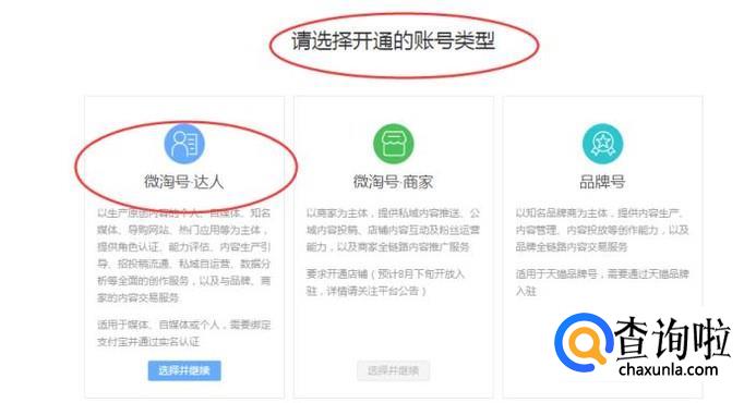 然后输入开通的账号类型,有【微淘号·达人】、【微淘号·商家】、【品牌号】三种选择,如下图所示: