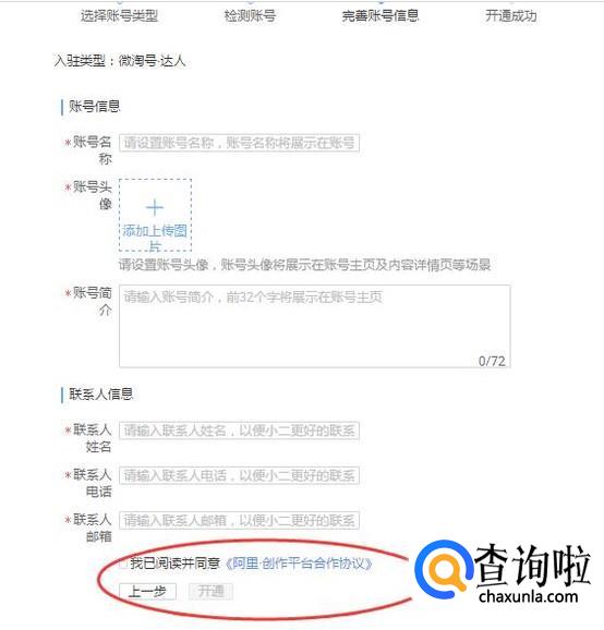然后输入账号名称、头像、简介等内容,就可以开通了,如下图所示: