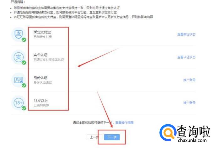 然后需要绑定支付宝、实名认证和身份认真,不过只要用过淘宝买东西,这些就都符合了,直接点击【下一步】,如下图所示: