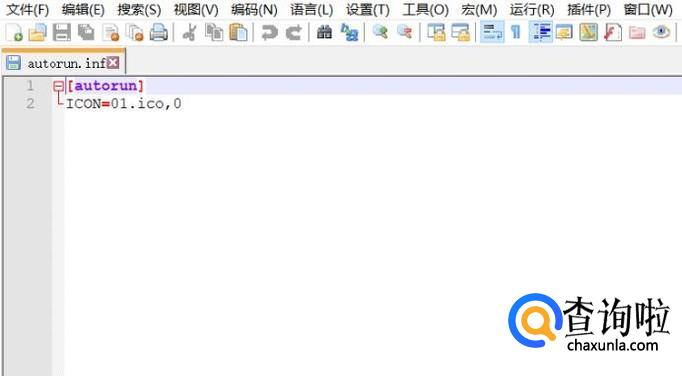 新建一个autorun.inf文件,文件内容[autorun] ICON=01.ico,0,如下图所示