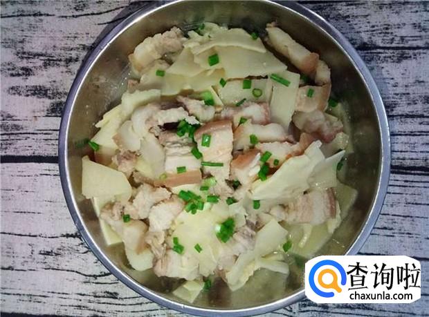 出锅,撒上葱花,即可享受美味的竹笋五花肉了,很饿的时候,吃一块五花肉,是一件很满足的事情。