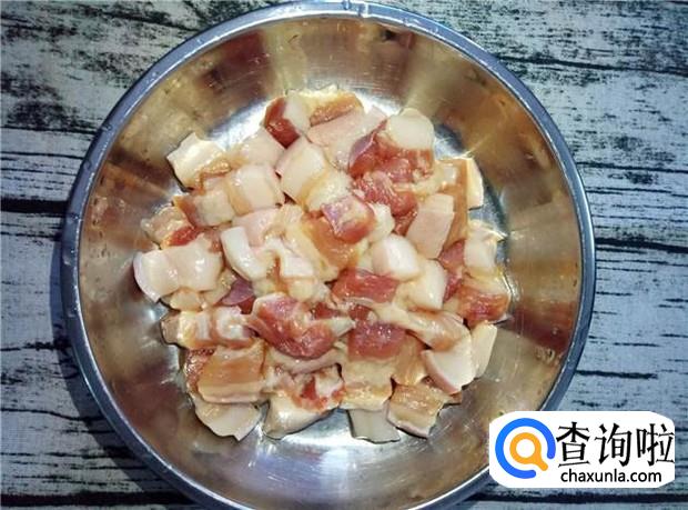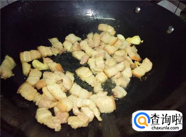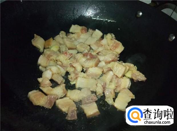 倒入腌制好的五花肉,中小火慢慢翻炒,把五花肉给炒出油,这样做出来的五花肉才好吃。