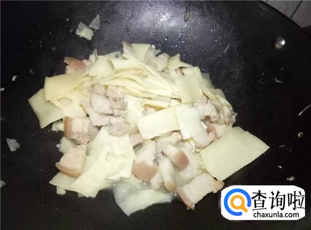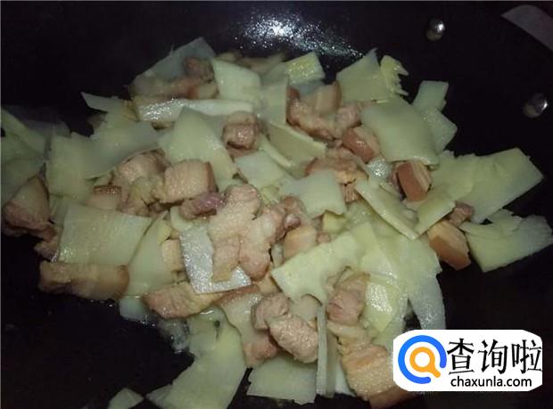 五花肉炸到金黄色,再倒入竹笋,加入适量的盐,翻炒均匀。