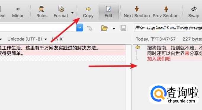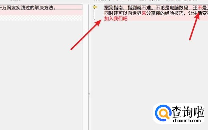 点击有不同地方的一行,在下方就会显示出这二行的内容,点击旁边的箭头图标,就会同步这里不同的内容。右箭头就是左边的文件内容同步到右边的文件,而左箭头就是把右边的内容同步到左边的文件里。