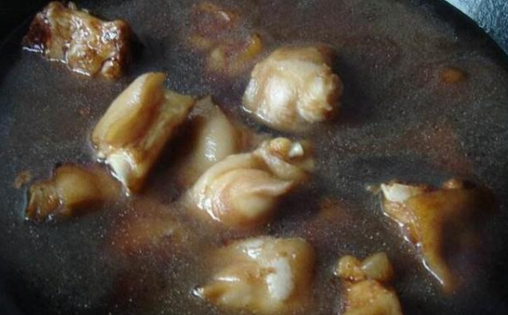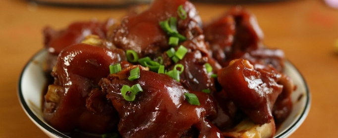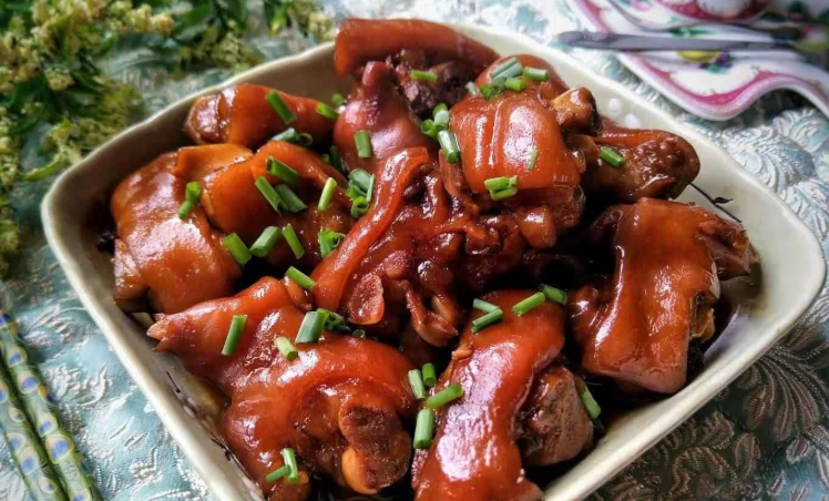 猪蹄切成小块放在锅中加入适量的清水,再加点料酒,焯水5分钟。起锅烧火,将糖炒至融化,再将猪蹄倒进来翻炒均匀,裹上一层糖色,然后再放入香叶等配料。之后再倒入适量的清水,炖1个小时左右。加入适量的食用盐,再炖半个小时之后大火收汁即可。
