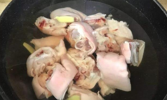 第一步:准备3-4个猪蹄,将它清洗干净之后切成小块放在锅中加入适量的清水,再加点料酒,焯水5分钟,焯水的过程中要将锅中的浮沫去掉,5分钟之后将猪蹄捞出来放在水中清洗干净备用。