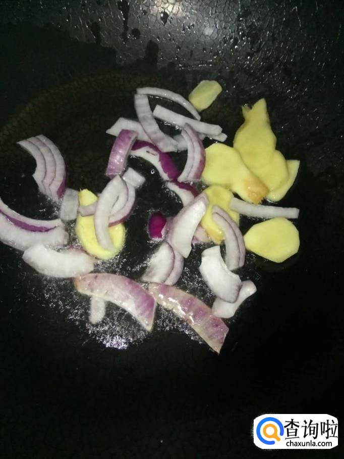取一块姜,将姜去皮洗净,切成薄片;取一小块洋葱,将洋葱最外层剥掉,洗净,切成小块;取三四个蒜头,将蒜头去膜,洗净,切成两半;