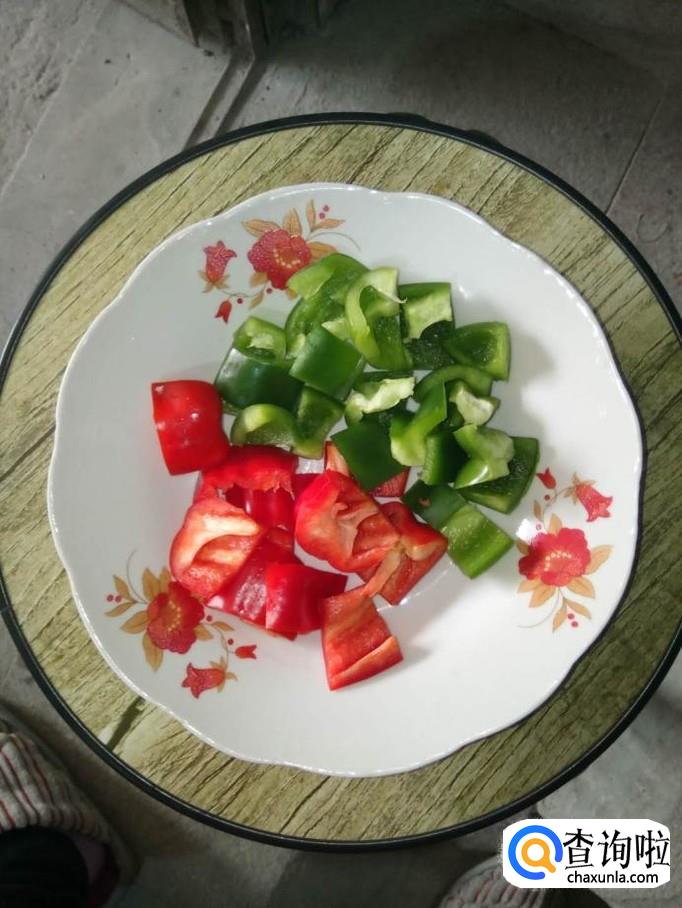 取青红椒各一个,将青椒和红椒去籽去蒂,洗净,再切成小块;青红椒可以为菜增添色彩;