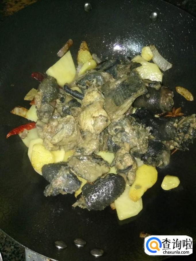将土豆和乌鸡下入锅里,翻炒几下,再加入适量的水,煮开;水的量以能够覆盖所有食材为准;大火烧开后,转为中火,焖煮15-20分钟;