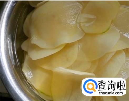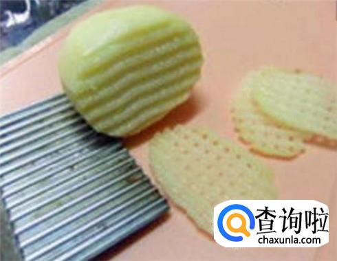 土豆去皮,用清水清洗干净,然后切成片,你家里要是有那种且大波浪片的波浪刀的话,直接切呈波浪形状吧,看起来更好玩一些。