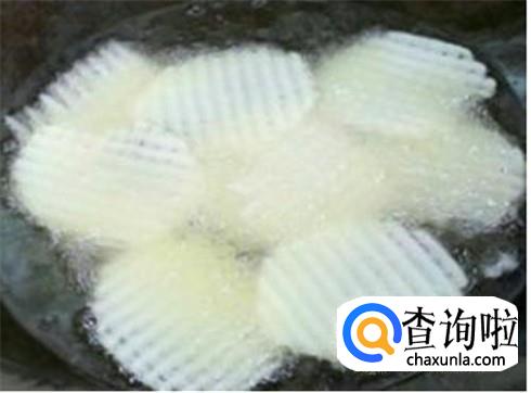 锅里面多放一些植物油,烧热之后把土豆片放进去炸,用漏勺不断的翻着防止炸的不均匀,等等土豆片金黄的时候捞出来。