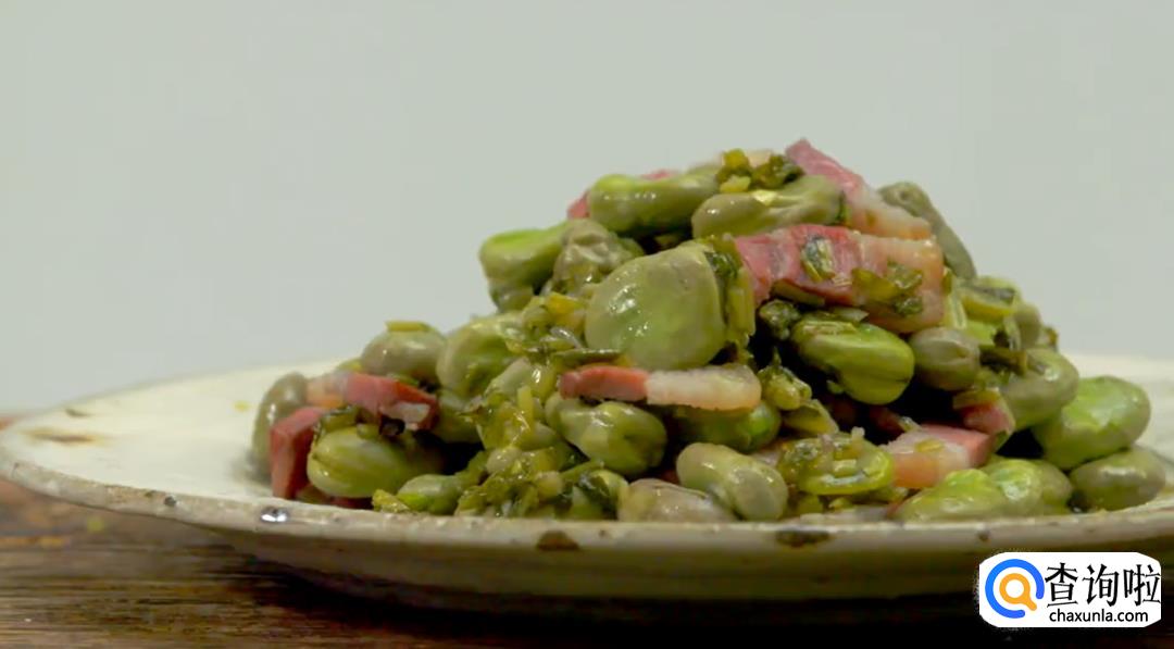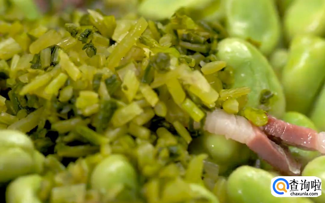 热锅起油,下咸肉片炒香后加入葱白翻炒,然后加入蚕豆,加入盐、黄酒和白糖一起翻炒,炒匀后加入雪菜翻炒。