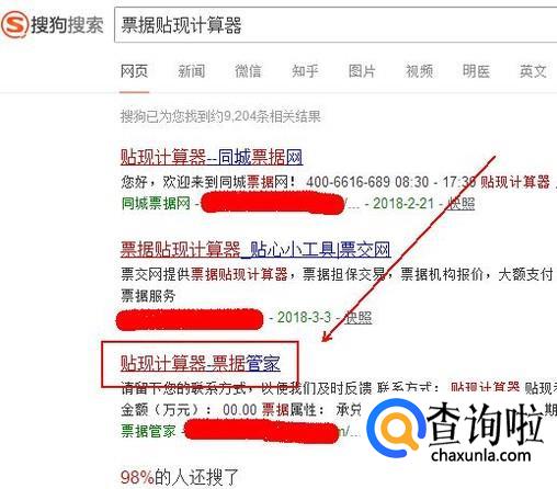 在搜狗所给出的搜索结果中找到“贴现计算器-票据管家”并点击进入。