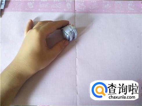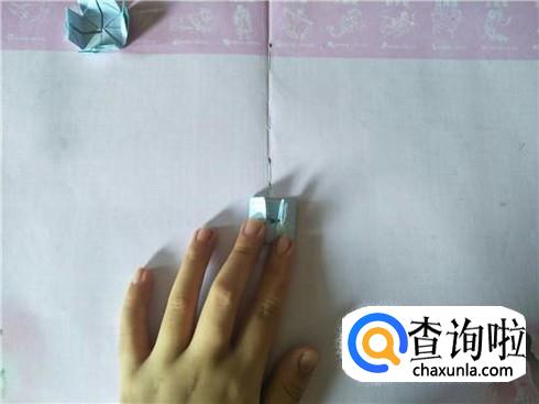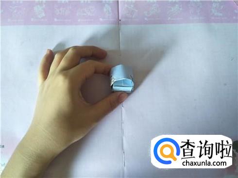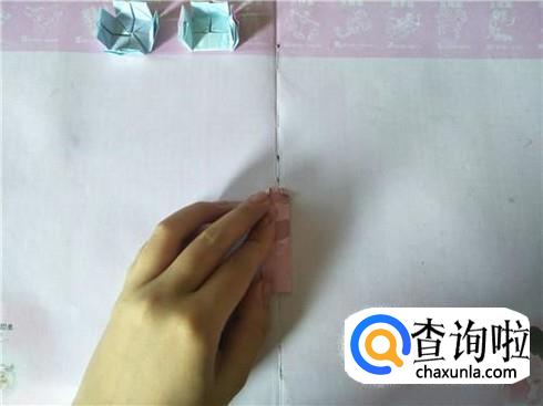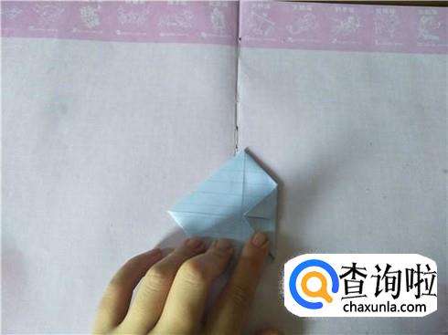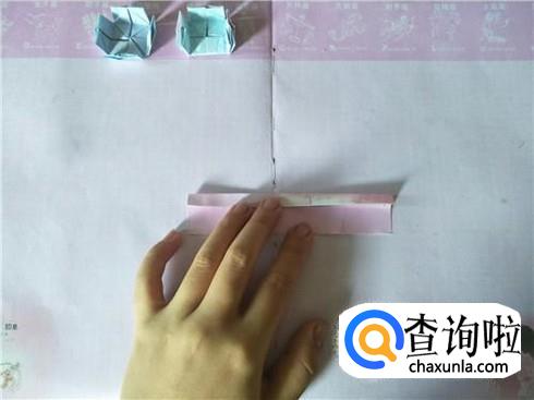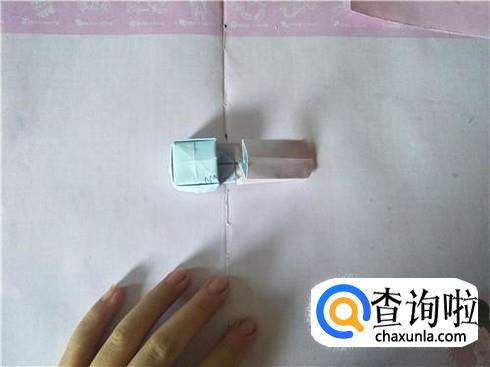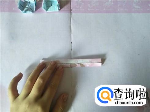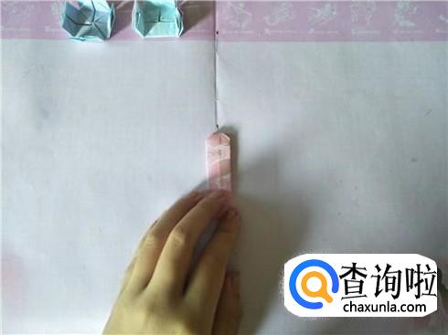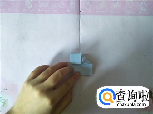 接着将其进行对折,在对折的地方折一个小的三角形,用力折叠,会出现一个折痕,然后再将其往里面进行翻折,另外再准备两张小纸片,折叠成一个狭长的长方形图形即可。