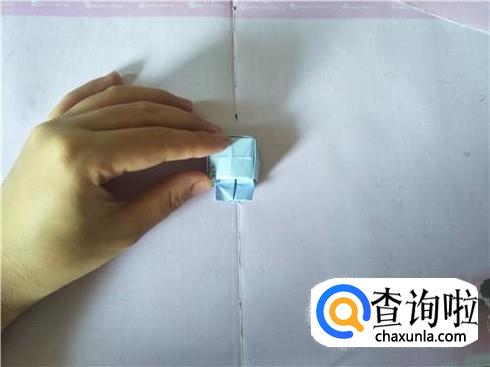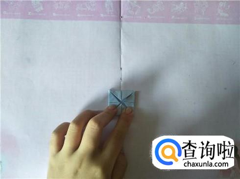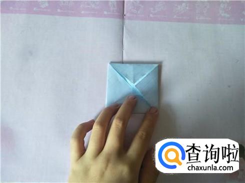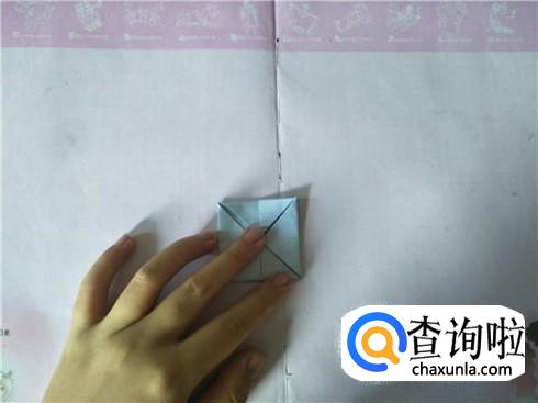 在折好的这个小正方形中,将四个角沿着折痕相交的中心点进行折叠,折叠之后会形成一个小正方形,然后将它翻到背面。