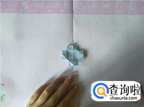 然后用同样的方法进行折叠,同样也会形成一个小正方形。将这个小正方形翻到背面,在背面会发现,正方形的四个角都有一个小正方形,接着将这四个小正方形进行翻折,形成一个小的长方形,最后就会形成一个不规则的图形。