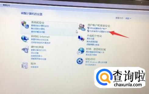在控制面界面,选择“用户账户和家庭安全”