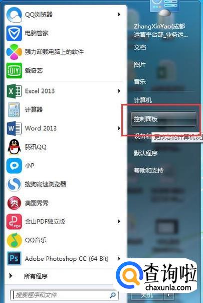 首先点击“开始”,然后点击控制面板。