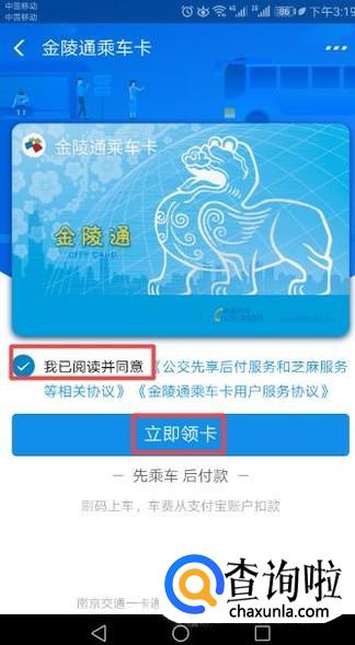 之后我们点击勾选上我已阅读并同意,然后我们点击立即领卡;
