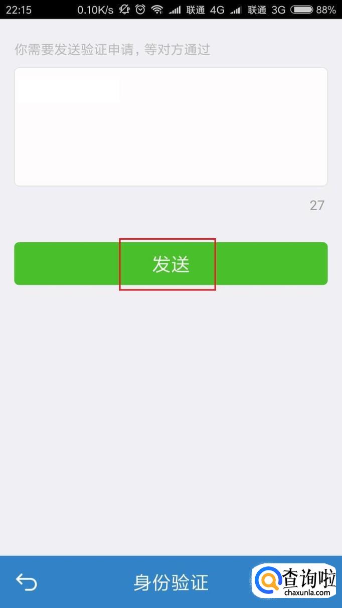 最后,我们在好友信息发送框中输入验证信息,并点击“发送”按钮,对方收到该验证信息并通过好友申请之后即可添加好友成功。