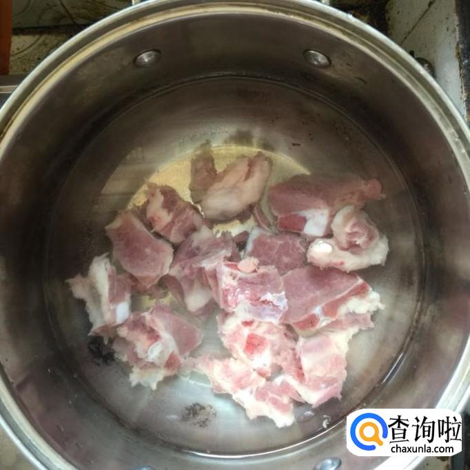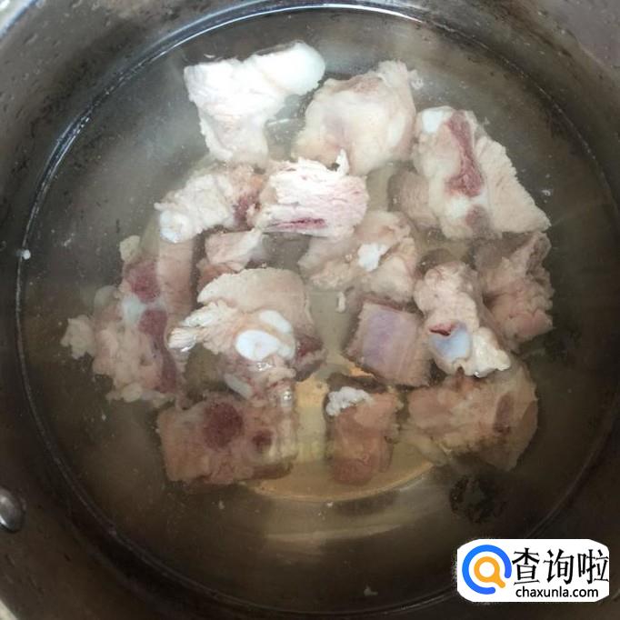 首先将买回来的排骨剁好,倒入开水中烫一分钟,如下图所示。