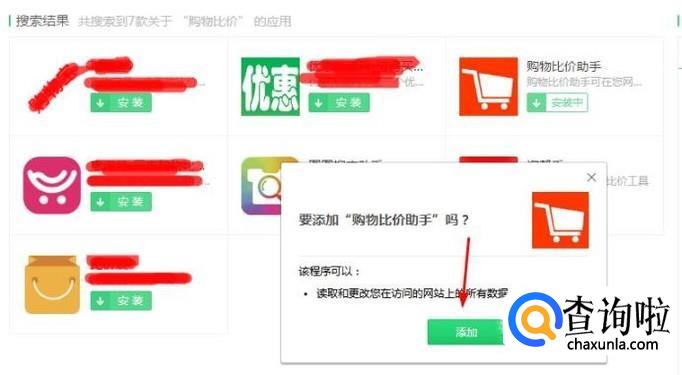 这时候就会弹出确认添加的窗口,我们点击“添加”安装完成后就可以正常使用比价插件了。