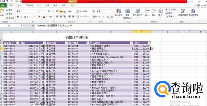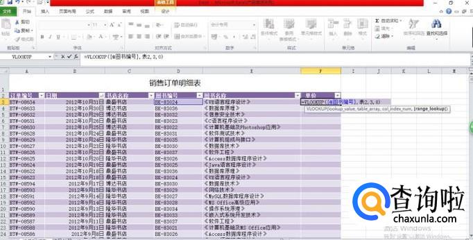此时就需要用到vlookup函数了。单击“F3”输入“=VLOOKUP([@图书编号],表2,3,0)”,回车,则成功应用了另一个表的数据,如图