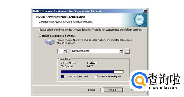 对InnoDB Tablespace进行配置,就是为InnoDB 数据库文件选择一个存储空间,如果修改了,要记住位置,重装的时候要选择一样的地方,否则可能会造成数据库损坏,当然,对数据库做个备份就没问题了,这里不详述。我这里没有修改,使用用默认位置,直接按“Next”继续。
