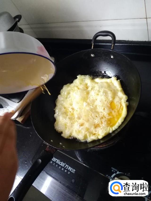 油热后,把搅拌好的鸡蛋液倒入锅中,鸡蛋液成型后,翻炒,如图,