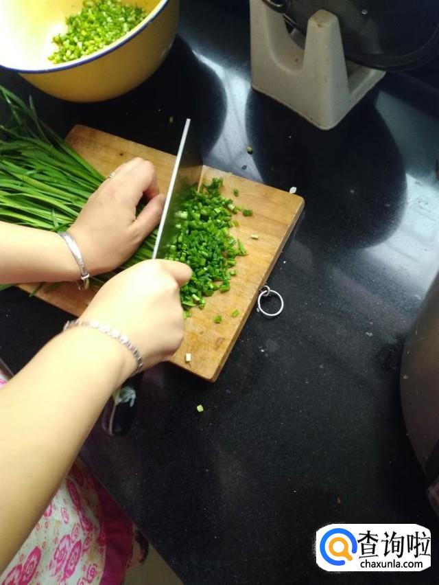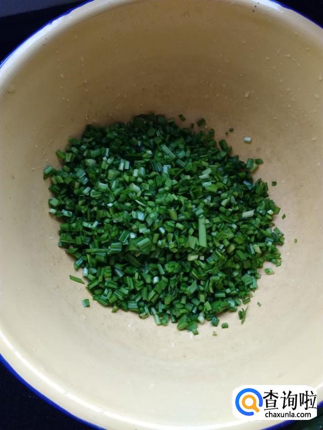 把少量韭菜放到案板上,切成2毫米左右的小段,切好后放入盆中备用,如图,