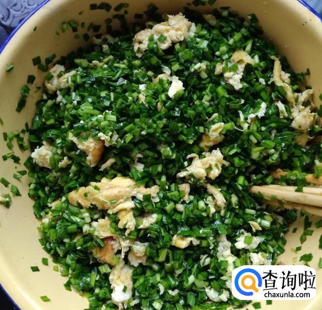 把炒好的鸡蛋倒入切好的韭菜的盆中,并加入适量的盐,五香粉,耗油,进行搅拌,