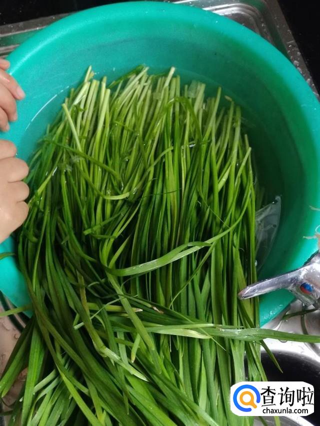 先把韭菜摘好,在水中多洗几遍,如图,
