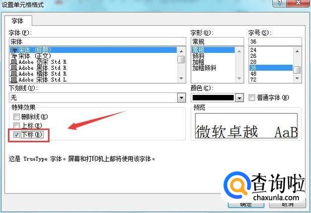 再在设置单元格格式对话框选择文字里的下标选项, 如图所示: