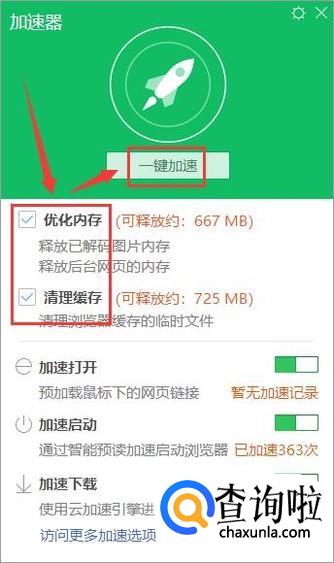 在弹出菜单中选中“优化内存”和“清理缓存”,点击上方的“一键加速”,这样就能清理浏览器占用的缓存和垃圾了。