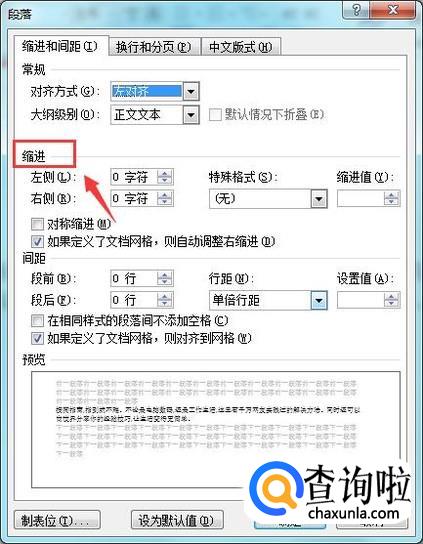 点击设置选项在弹出的对话框内我们可以找到缩进选项,如图所示: