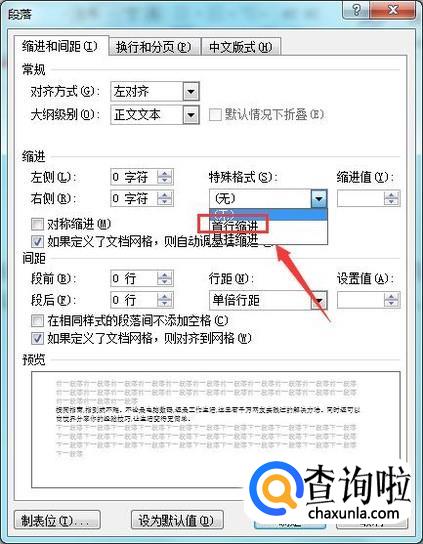 在缩进里我们找到特殊格式选项,点击该选项在其下拉菜单那里找到首行缩进选项,如图所示:
