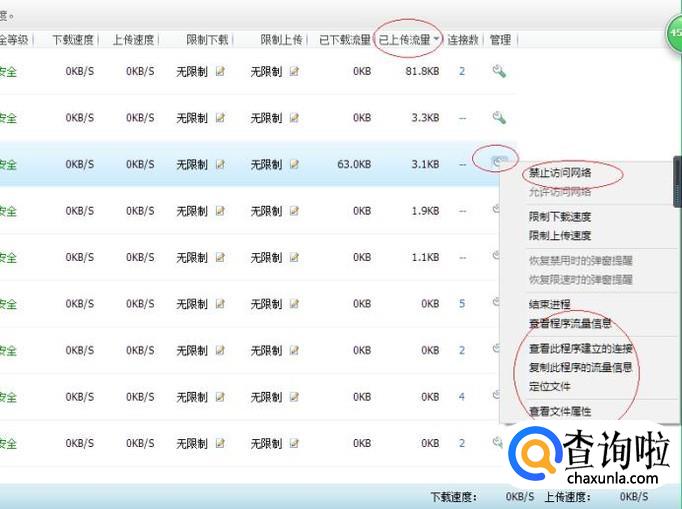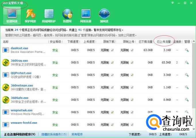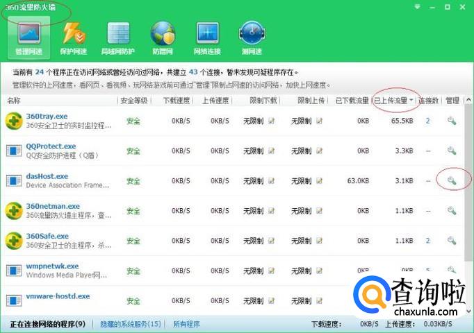 唤出"流量防火墙"应用窗口,我们可以点击"已上传流量"按钮。这样做的目的是对系统运行的程序按降序进行筛选,以方便用来查看。