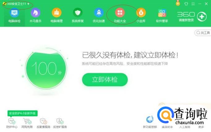 接下来唤出"360安全卫士"程序窗口,我们点击工具栏"功能大全"图标。"360安全卫士"由于是开放平台,功能大全的工具目前也是越来越多。