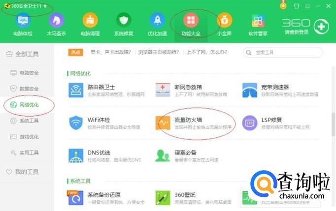 唤出"全部工具"选项界面,我们可以按照分类浏览寻找所需的应用。界面左侧选择"网络优化"项,右侧点击"流量防火墙"图标打开此项应用。